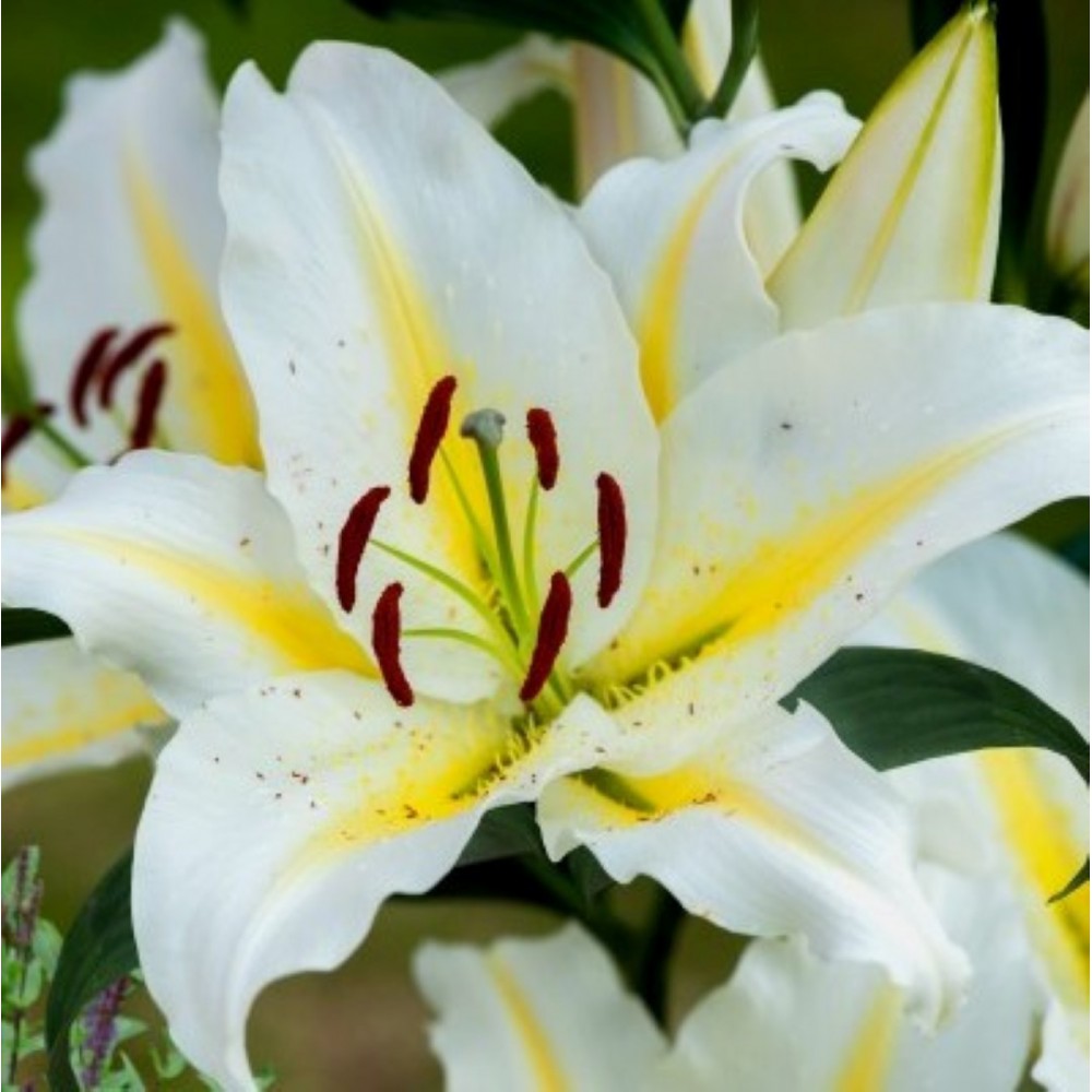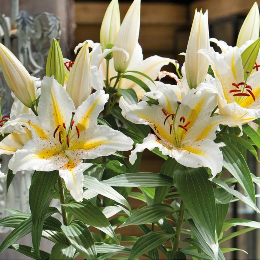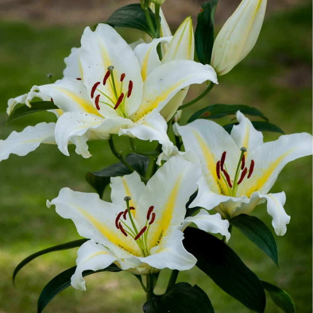 Dideli, kvapnūs, balti žiedai su subtilia citrinos geltonumo juosta per kiekvieno žiedlapio vidurį – elegantiškas ir išraiškingas akcentas jūsų sodui.